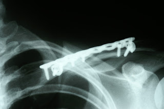 That, my friends, is a picture of a real live human shoulder in the middle of a surgical procedure called "open reduction internal fixation" or ORIF. This patient broke his collarbone, and the break was bad enough to need surgery to put it all back into place (the x-ray below is also a great example of a break that will need internal fixation of some sort). That teal plate that is sitting on the bone, is what the surgeon uses to put the bone back into place and hold it there. I was involved in the design of that plate.
